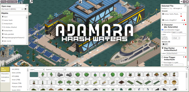 Adamara: Harsh Waters is a real-time collaborative multi-user game editor and an isometric RPG/adventure game. In combination, they are used in workshops for political education with young people.