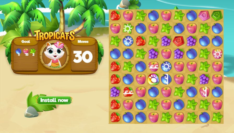 A Playable Ad for Wooga's game Tropicats. The ad has a full set of basic match 3 gameplay including 5 special gems that can be combined, a tutorial, multi-language support, and can be played via both mouse and touch.