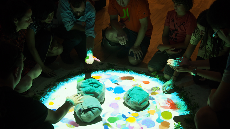In Shoal, an abstract fish pond is projected on the floor. A Kinect recognizes player gestures for fish-creation and interaction and real-life elements like rock-shaped pillows are used as obstacles.